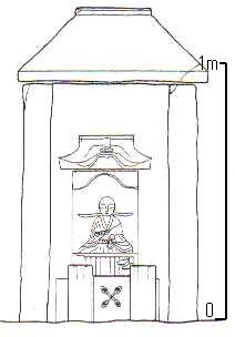 ![]() | 弘法大師を祀る・石龕(せきがん) 北の大谷のお大師さん実測図<BR> 東高野街道でも、星田、 打上から南へ向かう街道筋には、弘法大師を祀る石龕が、いまも多く残されている。 地区内では、「お大師さん」と呼ばれ親しまれ今も信仰されている。 像の台石には「四十番」「四十一番」など番号が刻まれている。これは、札所番号で、当時これらの大師像を巡る「八十八ヶ所霊場巡礼」が行われていたと考えられる。 |