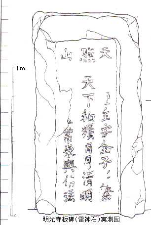 ![]() | 明光寺の板碑・実測図 ●古墳時代の石棺材を利用し、それを少し加工し、文字を刻んで碑に仕立てた。材料は凝灰岩。 ●偈頌(げしょう) 「天下和順 日月清明」 「伝説 無量寿経巻下」にみえる仏徳をたたえる詩。 |