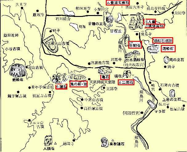 ![]() 2.鬼の雪隠・俎板7世紀、明日香村平田、野口 亀石に向かう途中に、鬼の雪隠・俎板がある。花崗岩の大石をくり抜いて造った石室と、その底石。 調査の結果、二つの石は、欽明天皇陵の横穴式石槨と判明。 もとは生駒郡斑鳩町御坊山古墳の石室のように組み合わせ上に土が盛ってあったが、古墳がこわれて石室がさかさまにころげ落ち、石室の方が鬼の雪隠(便所)、底石の方が鬼の俎板と言われるようになった。 |