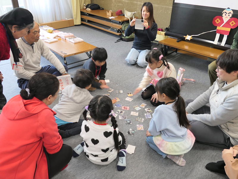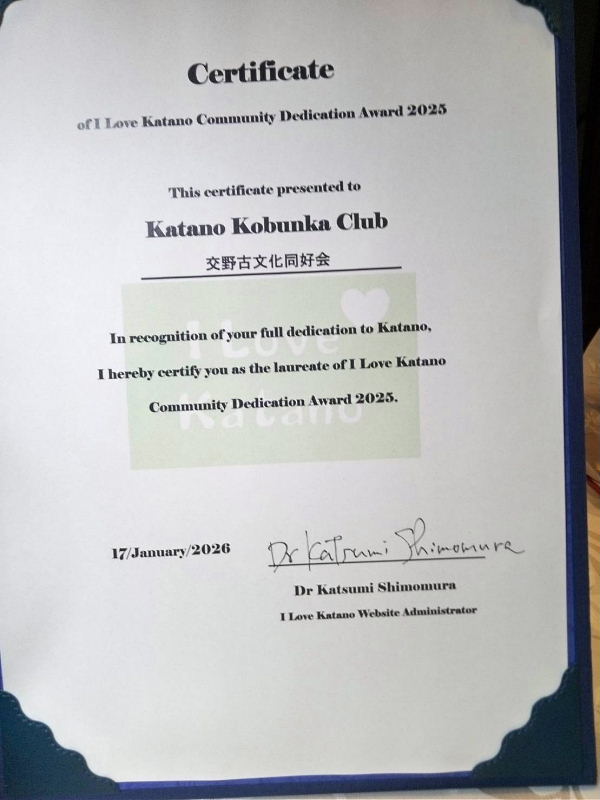 ![]() ![]() 2026.1.17(土) 午後1時半 武道館2F 交野古文化同好会が、お父さんお母さんと一緒に子供たちが 楽しくかるた取りをしながら、交野の歴史を知って頂けるようにと 昭和53年「交野郷土史かるた」が作られ、毎年かるた大会を始めて 今年で46回目を迎えました。 交野古文化同好会の巽会長を始め20名のスタッフの皆さんの ご協力を得て、参加賞の準備から会場の設営などスムーズに進み、 子供たちと参加者合同かるた大会は楽しく開催されました。 元気な子供たち12名(幼稚園児を含む)と参加者合同の総勢48名の参加。 読み札は井戸千津子さんの協力で、全員力一杯頑張りました。 井戸さんのリードで岸田さんと共に、「餅つき手遊び」手をたたき、 ぺったん〜ぺったんと二人一組になり、餅つき体操、 みんなで楽しく、リラックスして対戦に臨みました。 イベント「カルタの説明会」、「交野郷土史かるた」カルタ45枚の内 5枚「あ、か、き、こ、ひ」をプロジェクターにより、説明会が開かれ、 初めての試み、参加の皆さん、じっくり見入り、聞き入りました! 成績優秀者の3名には、手作りの「金・銀・銅」のメダルが、 参加者全員にに参加賞が渡され、来年も参加を呼びかけられました。 I LOVE KATANAの下村勝巳様より、交野古文化同好会が表彰されました! 下村勝巳様より、「長年にわたり交野の文化歴史の研究や継承に市民の 立場から貢献し、多くの交野市民に地域史の重要性について 今もなお説き続けていること」を評価いただきました。 当日は、交野メディア関係の交野新聞、交野タイムズ、 交野さんぽの皆さんも協力・支援・取材活動などに、 馳せ参じて頂き、大変和やかに賑々しく開催されました。 交野新聞の小川さんより、この日の為に「交野の美」カレンダーが たくさん寄贈され、参加者や協力者へ手渡され皆さん大喜びでした。 写真撮影協力 : 竹澤さん、下村さん スタッフの皆様、女子部の皆様、ご協力有難うございました! |