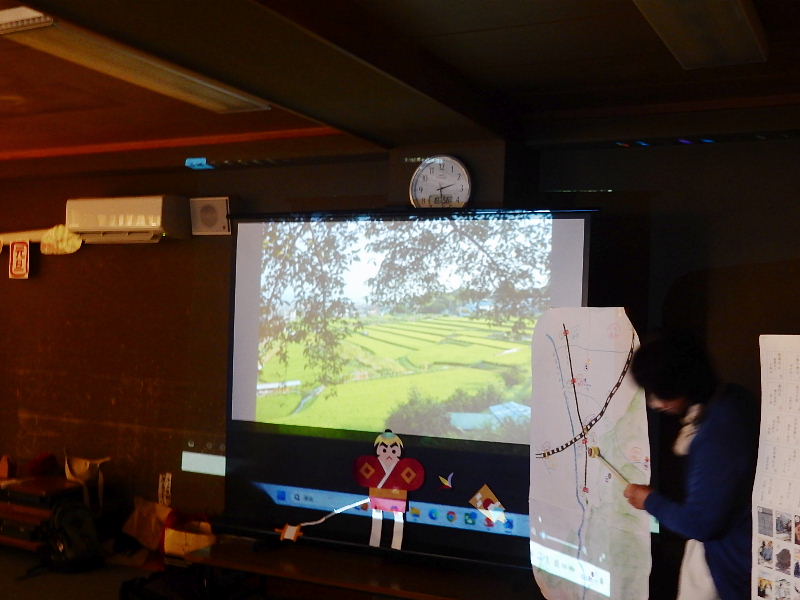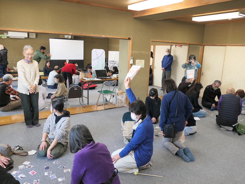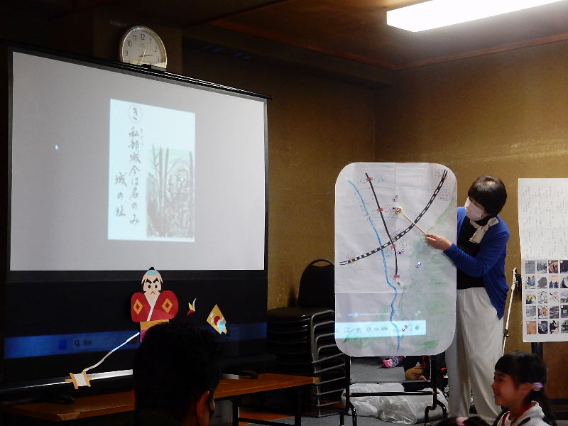 | 1回戦後、「交野郷土史かるた」カルタ45枚の内 5枚「あ、か、き、こ、ひ」のプロジェクターにより、説明会が開かれ、 初めての試み、参加の皆さん、じっくり見入り、聞き入りました! |