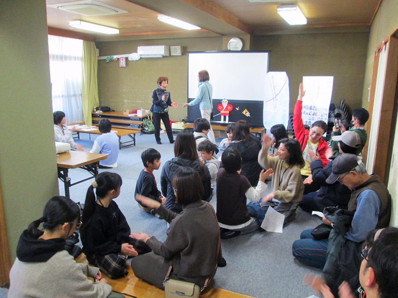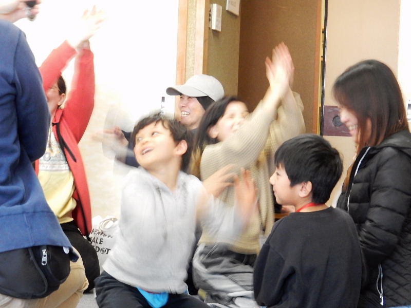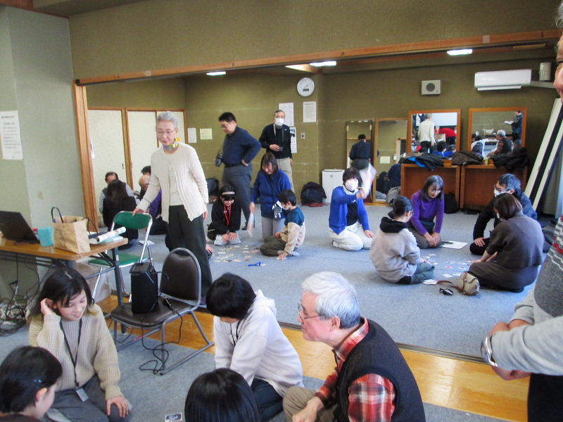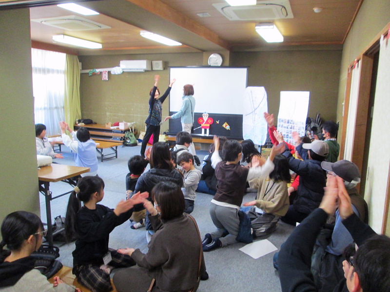 | 井戸さんのリードで、岸田さんと共に「餅つき手遊び」手をたたき、ぺったん〜ぺったんと 二人一組になり、餅つき体操、みんなで楽しく、リラックスして対戦に臨みました。 |