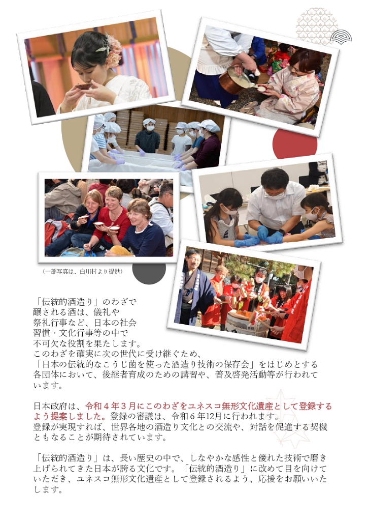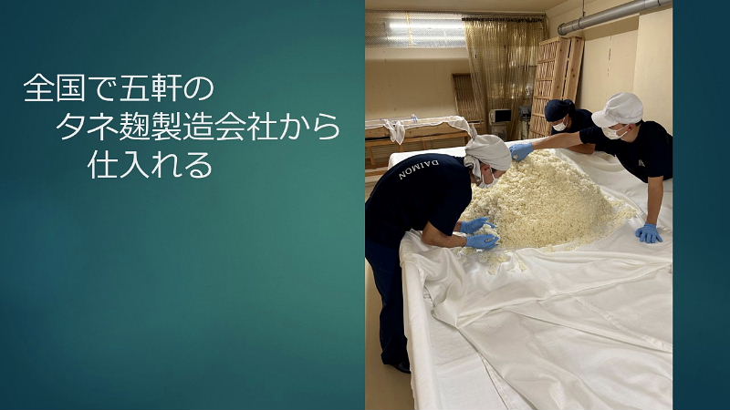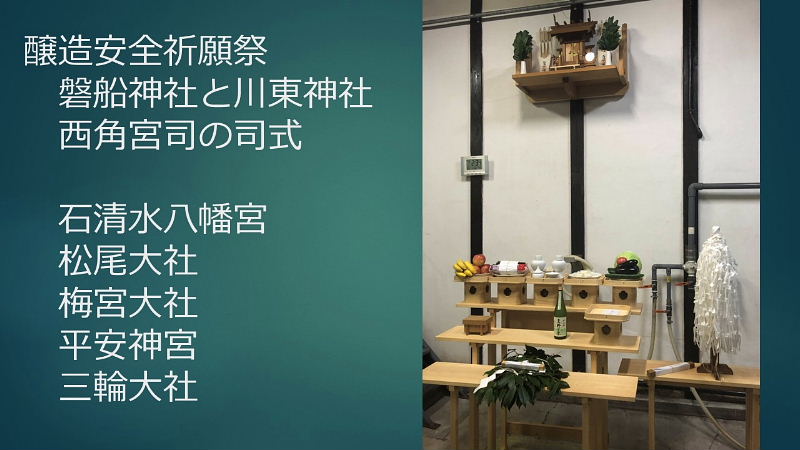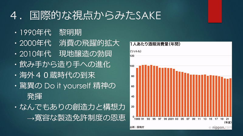 初めに; ★縄文時代中期(紀元前4,000年~3,000年)と言われ弥生時代の稲作と共に普及 ★神聖な醸造「口噛みの酒」(大隅国風土記) 神社の巫女が口噛みをして造った神様への神聖な捧げもの ★神話とお酒:日本書紀 古事記 ★神話に残る「八塩折之酒」 スサノオウノミコトが八岐大蛇を倒すために造られた酒 ★伝統的酒造り; 杜氏蔵人等が麹菌を用い築き上げた 酒造り技術(約500年前)~進化 ユネスコ無形文化遺産に登録 1, 大門酒造について 北河内、大坂の酒造りの歴史 上方摂河泉 昭和50年代 枚方・交野 7蔵 大阪府40蔵 天下の台所。良質の商品の集積地としての大坂。背景にある町人道文化の伝統 周辺の山々から湧き出る清水 肥沃な交野ヶ原の米 生産と消費のピーク 昭和48年度980万石/9億8千万本/1800ml 直近220万石 2, 伝統杜氏の技の歴史 江戸時代に形成された杜氏蔵人制度による酒造り 但馬、丹波、能登、南部、他 約30流派 職能毎の位階、杜氏(長)、頭(現場監督)、代師(麹造り)、モト廻り(酒母造り) 釜や(蒸米) 船頭(上槽) 追廻(雑事)、ままや(調理番) 杜氏 三役 甑倒し 皆造 発酵技術を集積した専門家集団 日仕舞から半仕舞、そして週仕舞へ、 3, 新しい酒造りの時代の到来 杜氏がプレーイングマネージャーとなる。工場長、製造部長化 数値管理の進化。労務作業の軽減化。作業時間の縮小化 新しいコンセプトの酒の誕生 飲み手の意識の変化 酒蔵の子弟の酒造りへの関与 定型的な味わいから個性ある味わいへの転換 19BYから蔵元杜氏 ノンアルコール飲料の動向 4,国際的な視点からみたSAKE 1990年代 黎明期 2000年代 消費の飛躍的な拡大 2010年代 現地醸造の勃興 飲み手から造り手へ 海外40蔵時代 驚異のDo it yourself精神の発揮 なんでもありの創造力と構想力 それを可能にする緩い製造免許制度 5, 将来への展望 蔵のある国や土地の風土と歴史を呼吸したサケ 日本のサケの模倣からの脱却 世界のアルコール飲料に抵抗できる「SAKE」のブランドの確立 ユネスコ無形文化遺産登録 交野乾杯条例制定 「酒に酔い、人に酔い、夢に酔う」 |