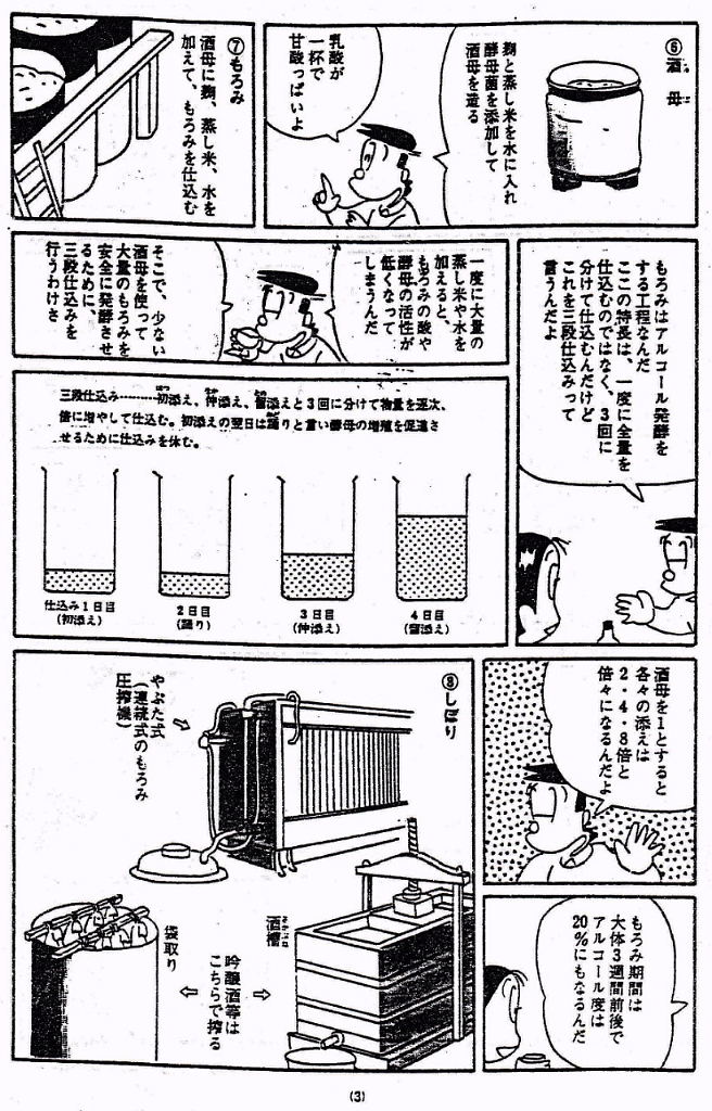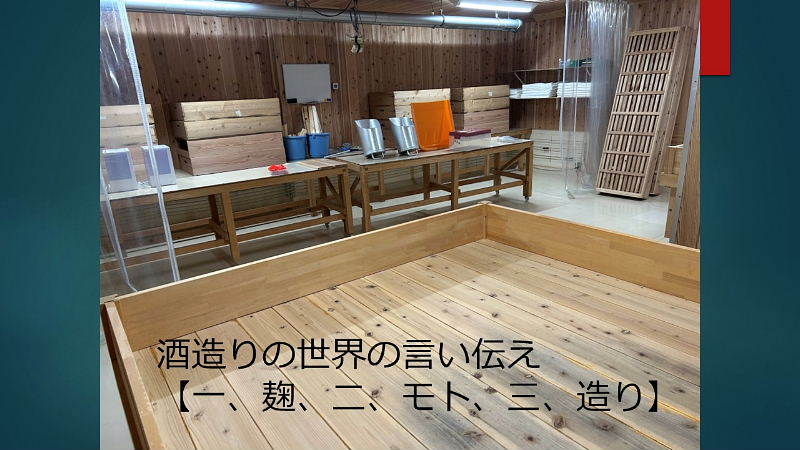 模擬酒蔵見学へのご案内 ・お米の話 酒造好適米と飯米の違い 精米の話 タンパク質と脂肪の除去 特定名称酒の定義 ・仕込み水の話 軟水と硬水 発酵の違い 酒の性質の違い 灘の男酒、伏見の女酒 ・洗米と浸漬 蒸米 麹米と掛米 限定吸水 吸水歩合 ・蒸米 甑(こしき) 米を軟らかくする ・麹米造り 麹ムロ 酒造りの基幹作業 デンプンを糖に変える 麹菌の話 酵母菌を育てるためのエサ造り 果実酒との違い 二昼夜の工程 「一麹、二モト、三造り」 ・酒母造り 酵母菌の培養過程 速醸モト 15日造り 水、麹米、純粋酵母、蒸米 ・モロミの仕込 三段仕込み 仕込み作業とは水、麹米、蒸米をタンクに投入する工程 仕込配合 味わいのコントロールは? 五味のバランス「甘、酸、辛、苦、渋」 ・モロミ発酵期間 普通酒と吟醸酒の違い 吟醸酒の定義―低温長期発酵の酒 ・上槽(じょうそう) モロミを固形分と液体に分離 酒粕と無濾過生原酒 ・ろ過 火入 割水 瓶詰 出荷 熟成 |