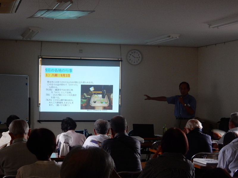 | <第148回> 令和7年9月定例勉強会 『交野の暮らしと習慣 ③』 第1部 フェノロジーカレンダー9月・10月の行事 第2部 茶話会;各地の行事習慣の変化と課題点 講師:向井 克喜氏(交野古文化同好会 副会長) 青年の家・学びの館 午前10時~12時 31名(会員30名)の参加 |