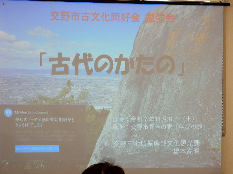 | <第150回> 令和7年11月定例勉強会 「古代のかたの」 講師: 橋本 高明氏(交野市地域振興部文化観光課) 青年の家・学びの館 午前10時~12時 43名(会員35名)の参加 |