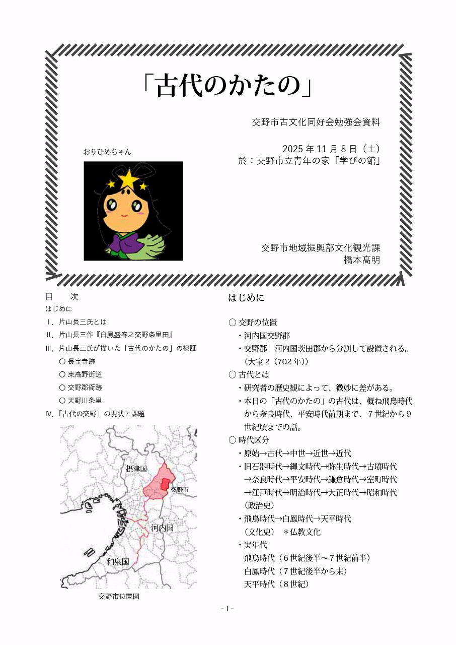 | 「古代のかたの」レジメ 講師 : 橋本 高明氏(交野市地域振興部文化観光課) 「古代のかたの」レジメ(PDF) |