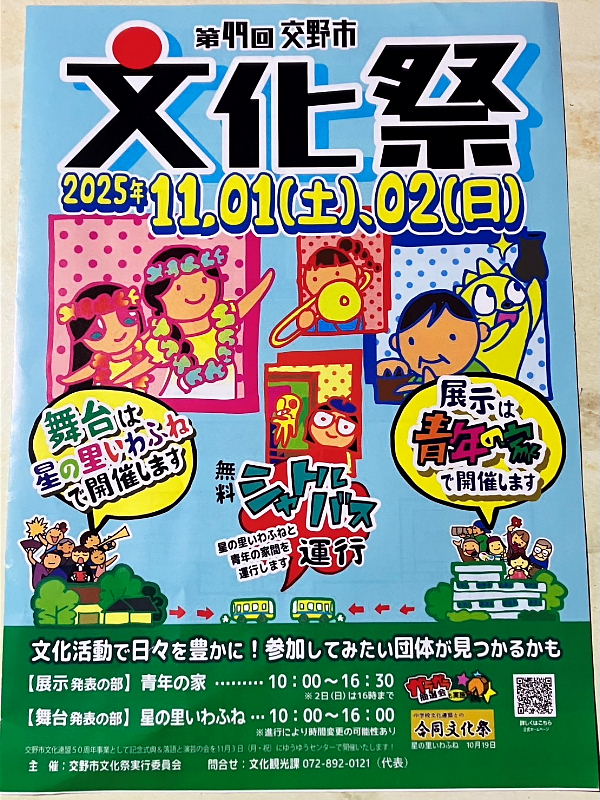 第49回 交野市文化祭 展示の部 2025.11.1(土) 〜 11.2(日) ![]() 「交野の自然と暮らし」 フェノロジーカレンダーとお酒と文化 饒速日命と交野物部氏 古文化同好会の活動報告など |