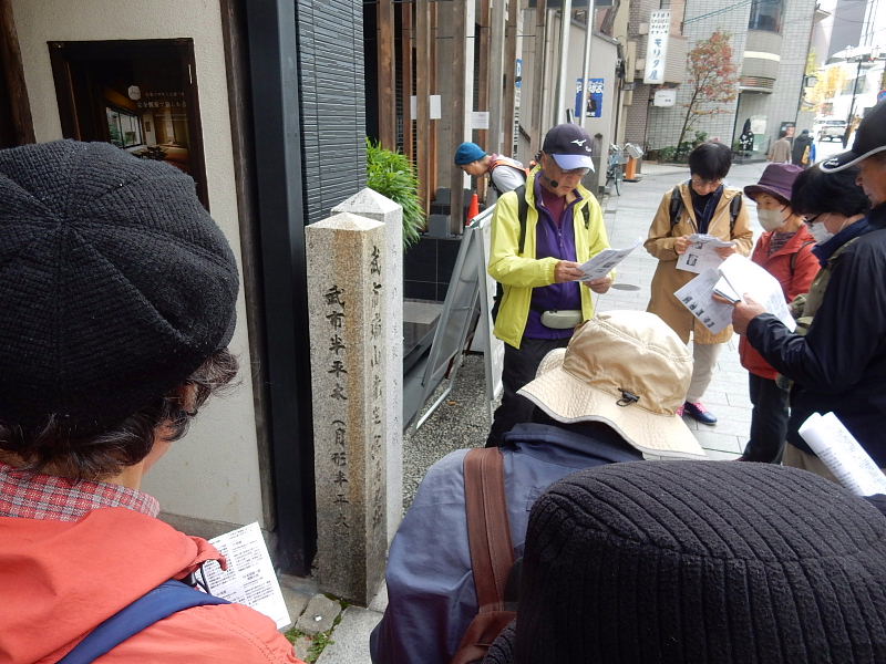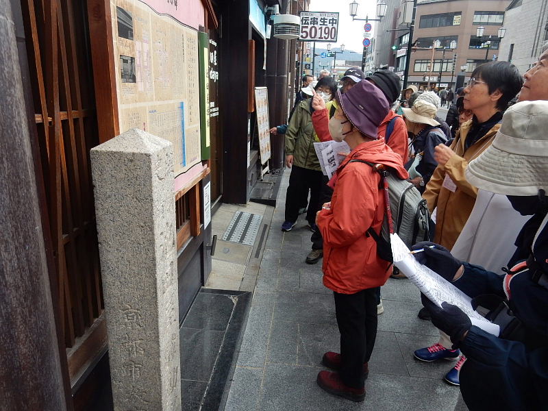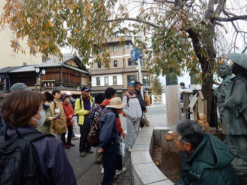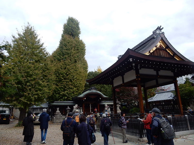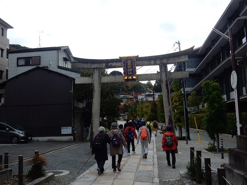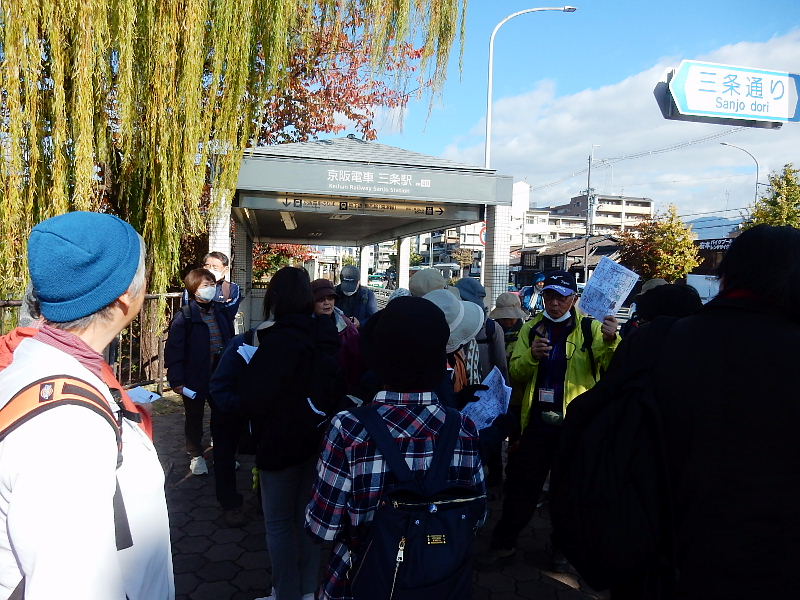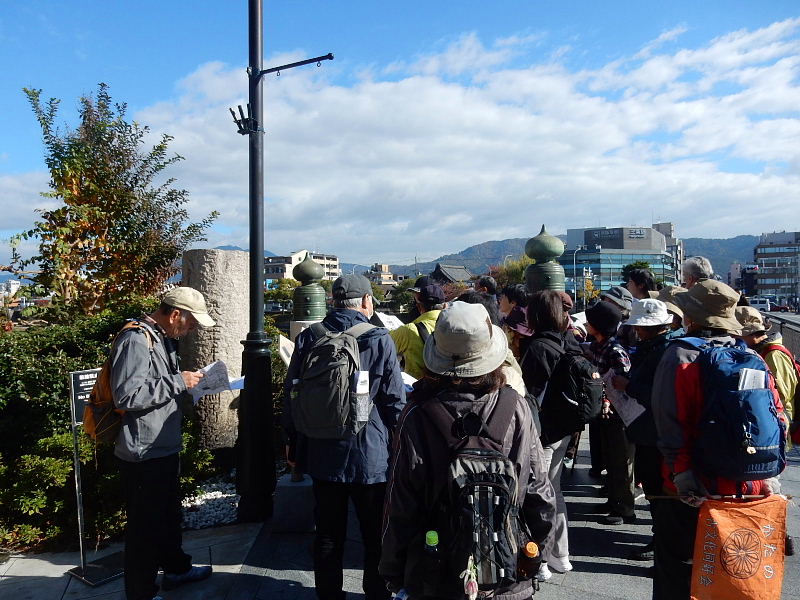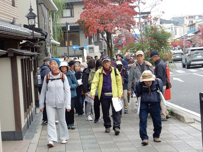 本日案内していただく森岡さん(古文化同好会)より、本日の行程及び注意事項について、京の町は紅葉が始まりどこも混雑しています、信号を渡るときは無理をしないで余裕を持って渡るよう、全員が渡るのを確認してから出発します。等の説明があり出発です。 |