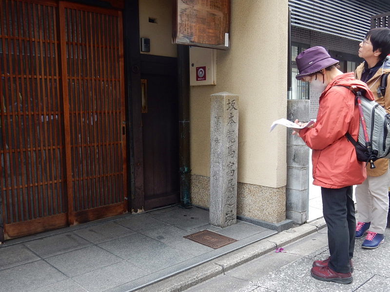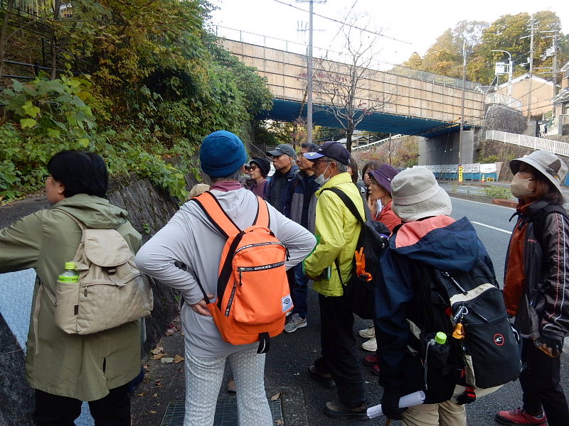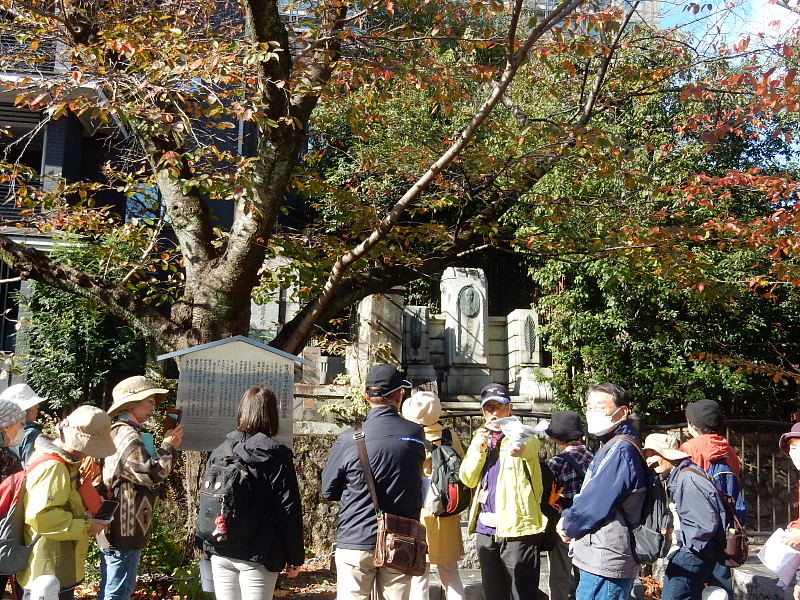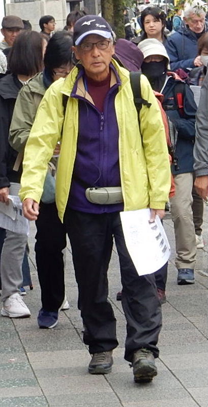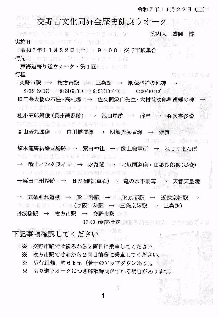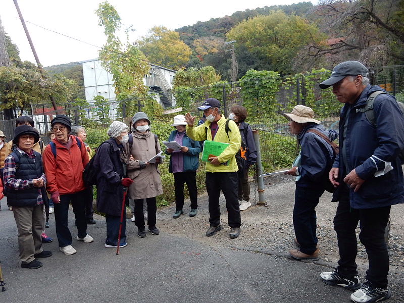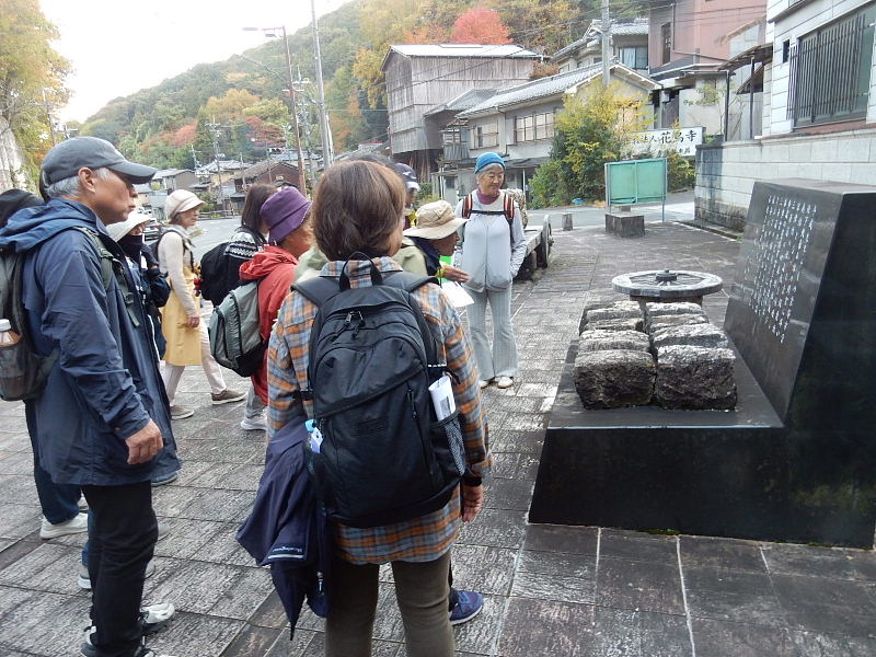 本日案内していただく森岡さん(古文化同好会)より、本日の行程及び注意事項について、京の町は紅葉が始まりどこも混雑しています、信号を渡るときは無理をしないで余裕を持って渡るよう、全員が渡るのを確認してから出発します。等の説明があり出発です。 |