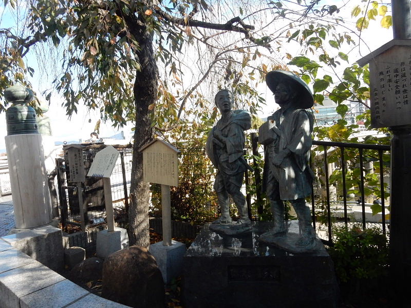 | 江戸時代後期の戯作者・十返舎一九の「東海道中膝栗毛」に出てくる、人気者の二人の像です。物語の中では三条大橋に近い宿屋に泊まった際、ハシゴを買わされるという、笑い話のような愉快な話が出てきます。 |