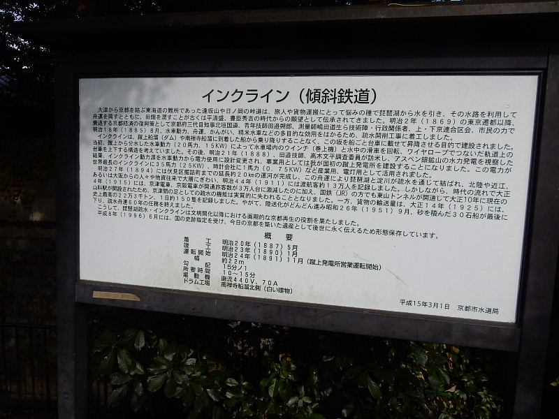 | 疎水上流の蹴上船溜と下流の南禅寺船溜を結んだ全長約582mの傾斜鉄道で、建設当時世界最長でした。約36mの高低差を克服するために舟を台車に乗せ、ケーブルカーと同じ原理で運び、舟は貨物の積み下ろしせずに、高低差を乗り切ることができる。現在は、レールが保存され、自由に歩くことが出来ます。 |