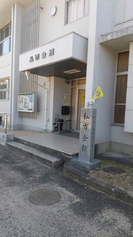 私市会館 昭和46年開館された。毎朝のラジオ体操や盆踊り・秋祭りで開館前の広場はにぎわう。