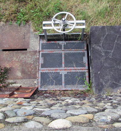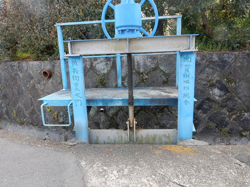 加賀田用水路への取り口は、市大植物園に渡る日の出橋の上流300mの場所にあり、落差10mはあろうか、天の川を石組みで堰き止め左手に造られている。加賀田用水は、私市から森、私部へと広く田圃の灌漑用水として今も利用され続けている。天の川の水を上手く取入た先人たちの汗の結晶である。
