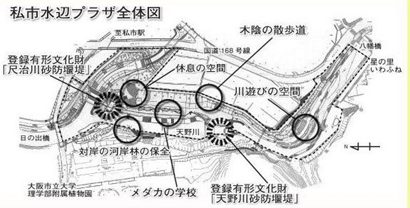 私市仁左衛門旧宅跡〜私市橋〜天野川取口・会所と堰〜私市水辺プラザ〜