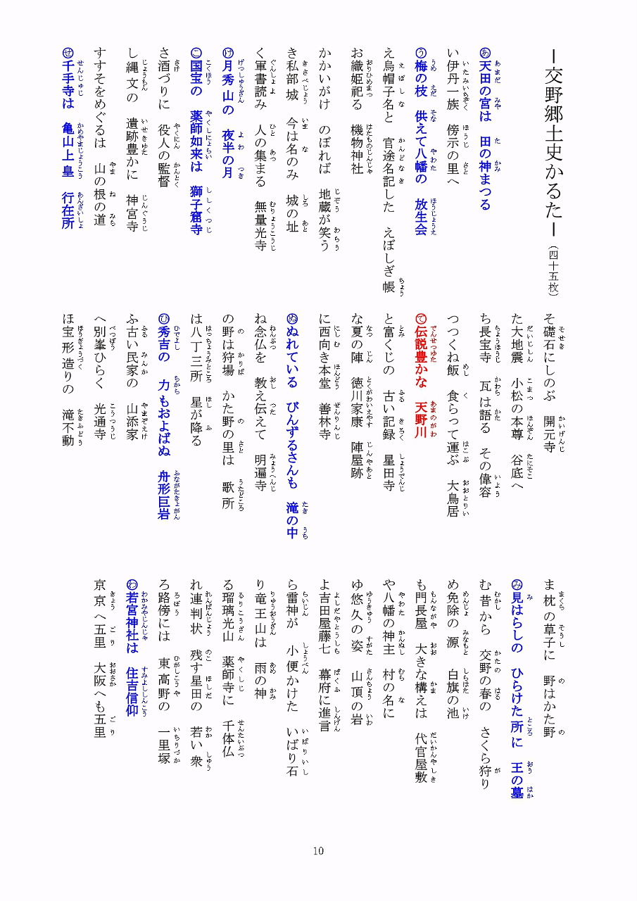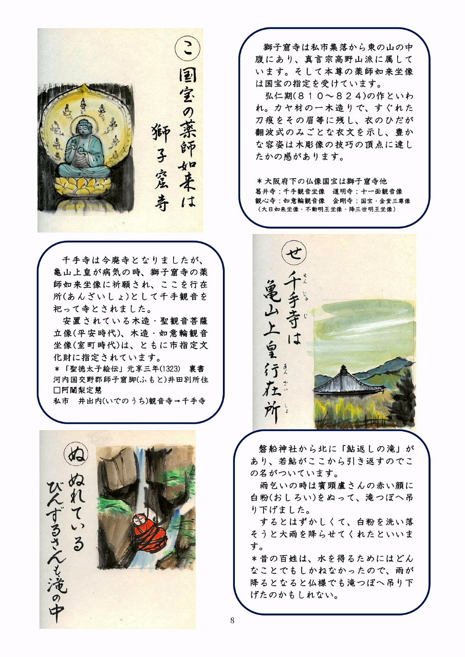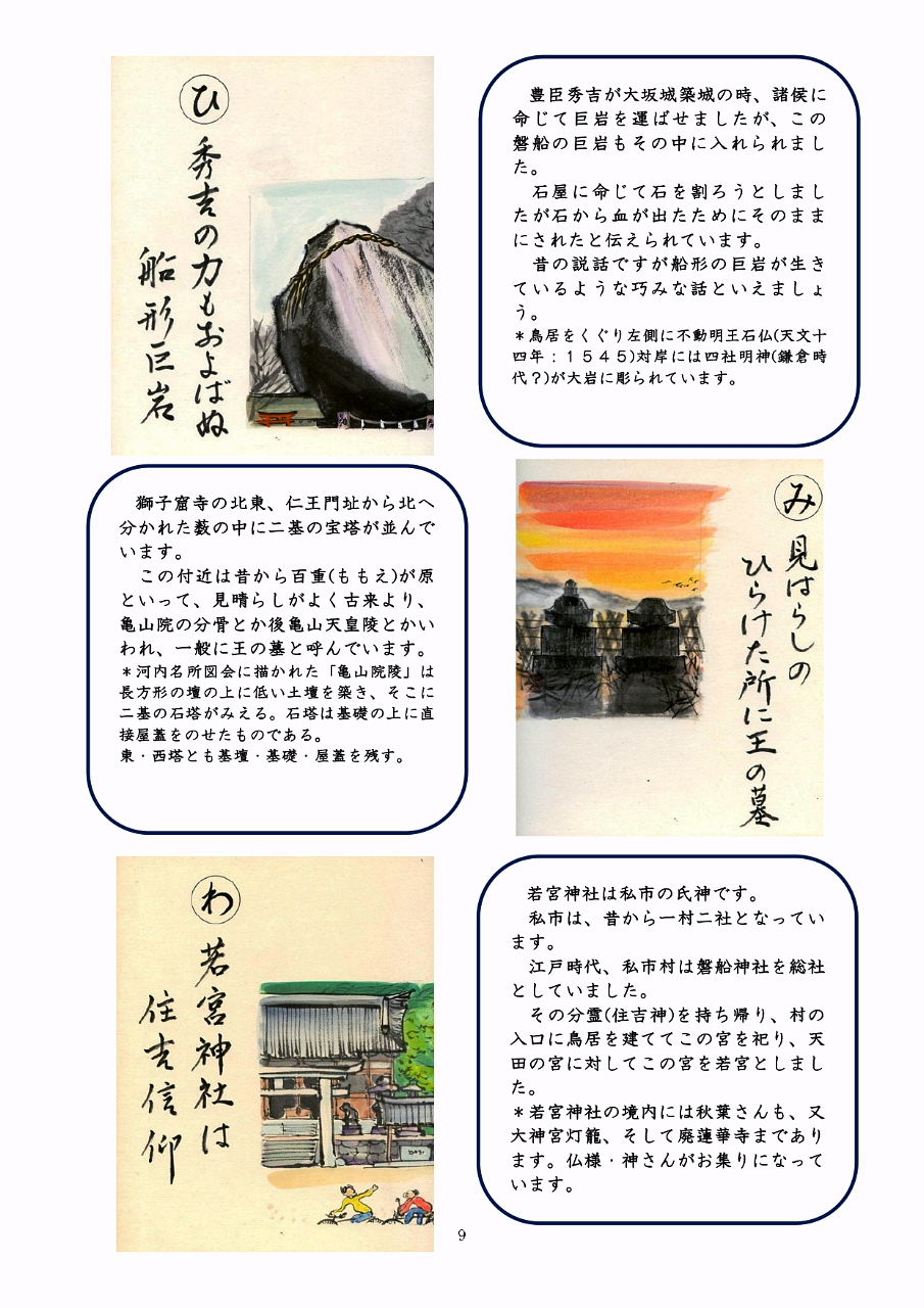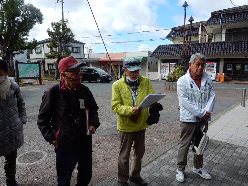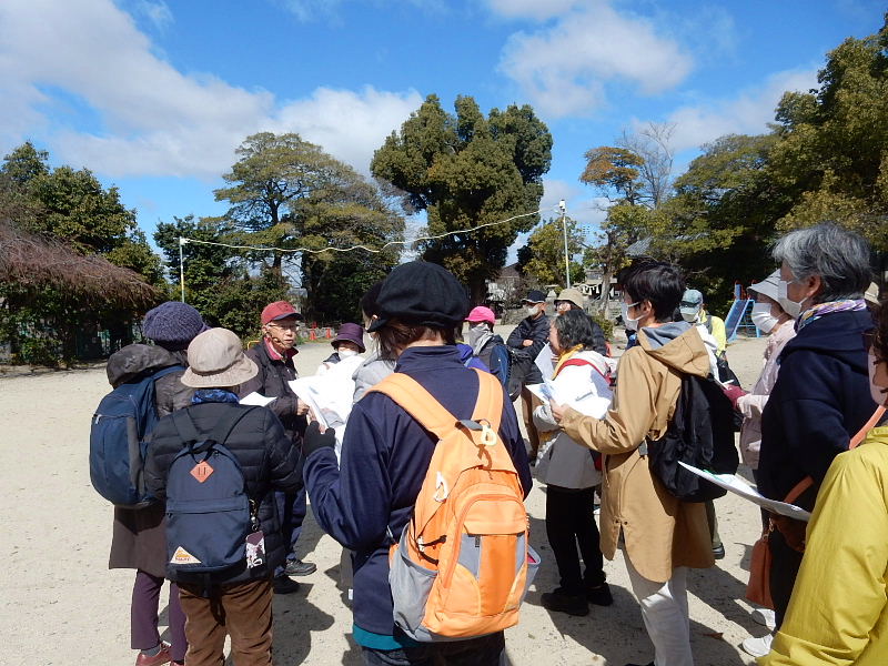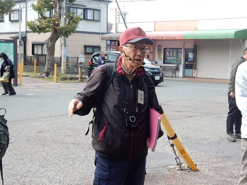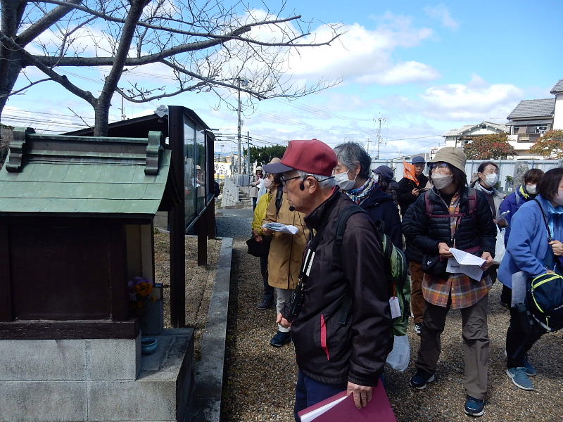 巽 憲次郎会長から「本日は早朝からたくさんご参加くださりありがとうございます。特に女性の方々が多いようですね。皆さん、無理をされずに楽しく歩いてください!」との挨拶があり、早速、村田さんの案内で「交野かるた巡り=私市編A=のレジメと当日の行程に沿って、解説を聞きながら史跡をゆっくりと巡ってきました。