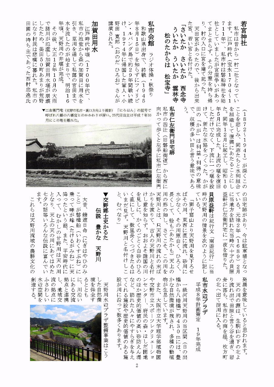 加賀田用水 : 江戸時代中頃(1700年代)、私市の池堂から森の加賀田に用水を引き、草川を通して私部の官田まで水を流したのが始まりで、明治16年頃、天野川の井堰が完成。
