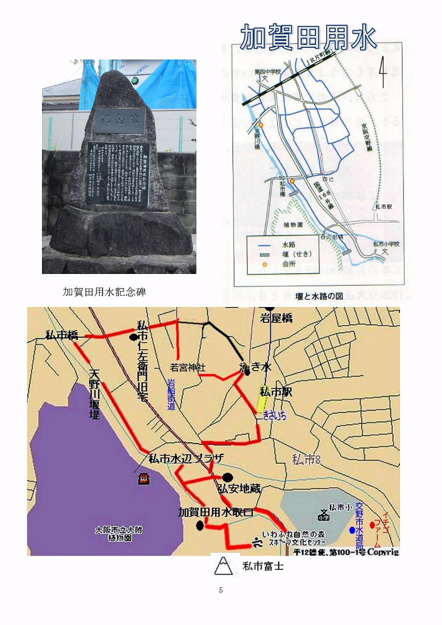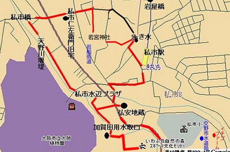 行程 : 私市駅〜土生川〜窪坂の湧き水〜若宮神社〜加賀田用水〜磐船街道四辻〜