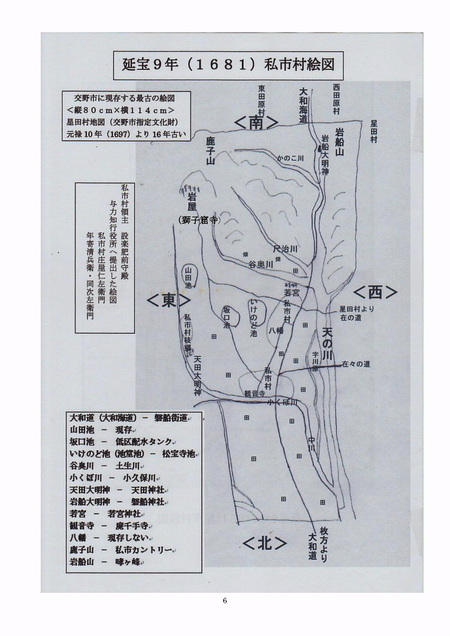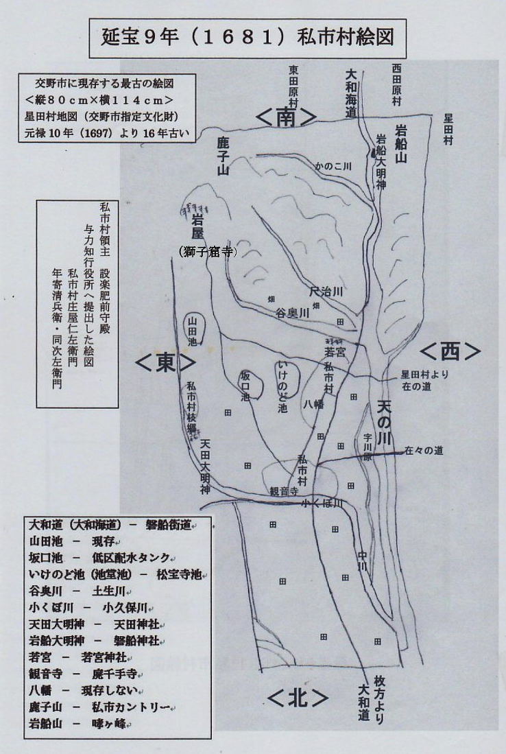この延宝9年(1861)の「河州交野郡私市村絵図」は、交野市に現存する最も古い絵図で、交野市指定文化財とされた元禄10年(1697)の「星田村絵図」より16年も古い絵図で、希少価値のある文化財です。