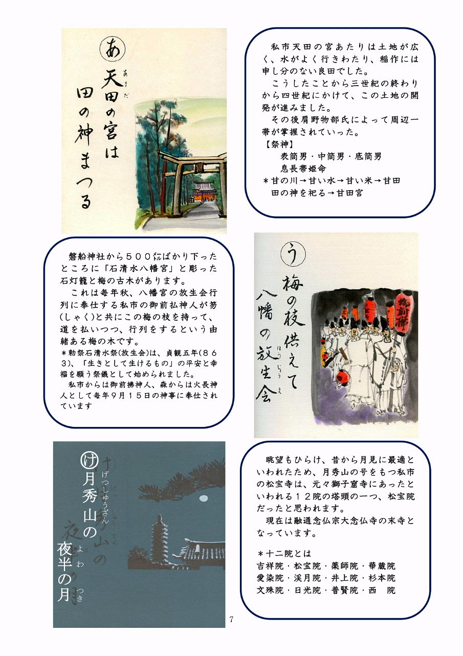 その後、宮座の事が解決せず、約二九〇年前各村々(大和、河内)は磐船明神の分霊を神輿にのせて持ち帰り祭祀しましたが、私市には古くから天田神社がありましたので、若宮神社と称号したのでありましょう。